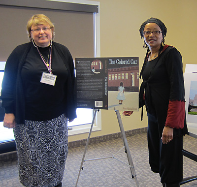 Jean Alicia Elster with Lyon Township Public Library (Michigan) Youth Services Librarian, next to visual aids for The Colored Car presentation.